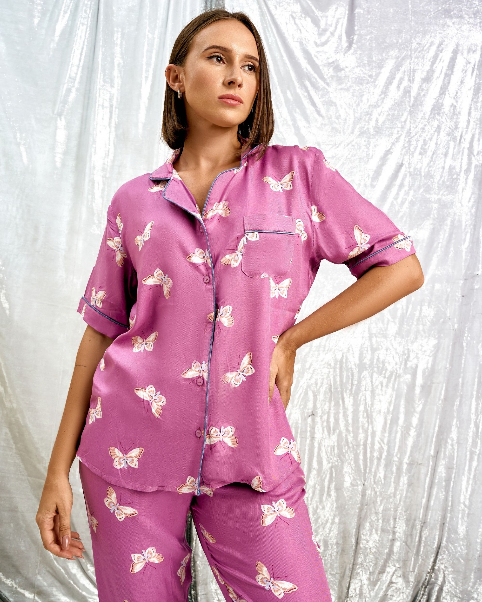 The butterfly print adds a delicate and eye-catching element, making this set perfect for both nightwear and elevated home wear.