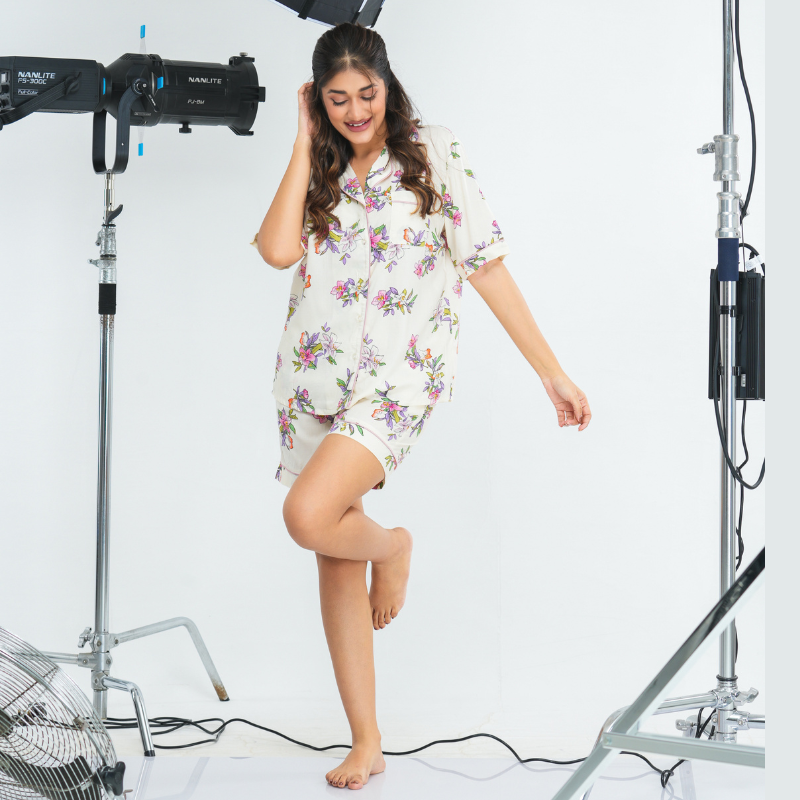 Drift into comfort with our Floral Bliss Viscose PJ Set, crafted from soft, breathable viscose for a lightweight, airy feel. The set features a short-sleeve button-down shirt and matching shorts, both adorned with a vibrant floral print. Elegant contrast piping along the shirt front, sleeve hems, and short hems adds a refined touch. Perfect for lounging in style or a cozy night’s sleep.