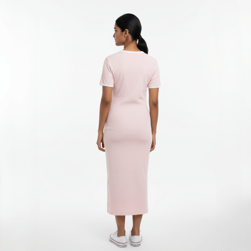 Crafted from soft rib knit fabric, the Light pink Rib Midi Dress features contrast white rib detailing at the neck and sleeve hems for a clean finish. Designed with a flattering bodycon fit, side slit, and mid-calf length, it’s your go-to for effortless everyday style.
