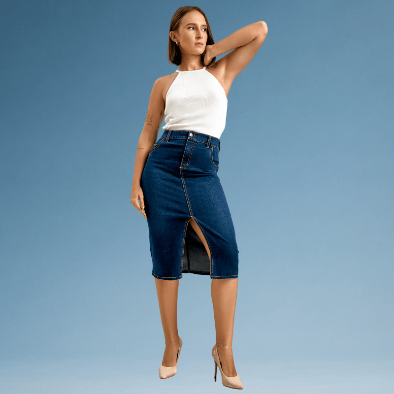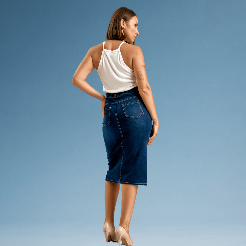 Made from denim with 98% cotton and 2% spandex, this skirt is designed with a midi-length front slit, a back elasticated waistband for comfort, and a classic button-and-zip fastening.