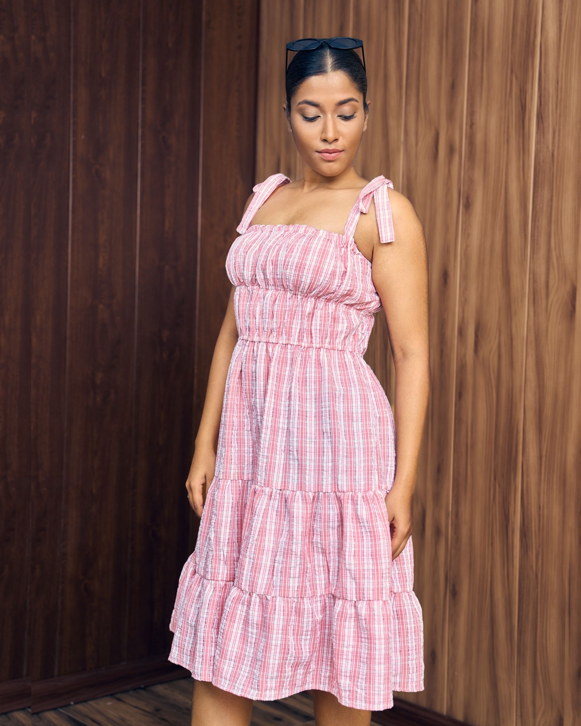 Designed with delicate adjustable tie shoulder straps and a softly gathered elasticated bodice, this silhouette creates a flattering and comfortable fit. The multi-tier midi skirt adds graceful movement and a romantic finish, making it perfect for warm-weather dressing.