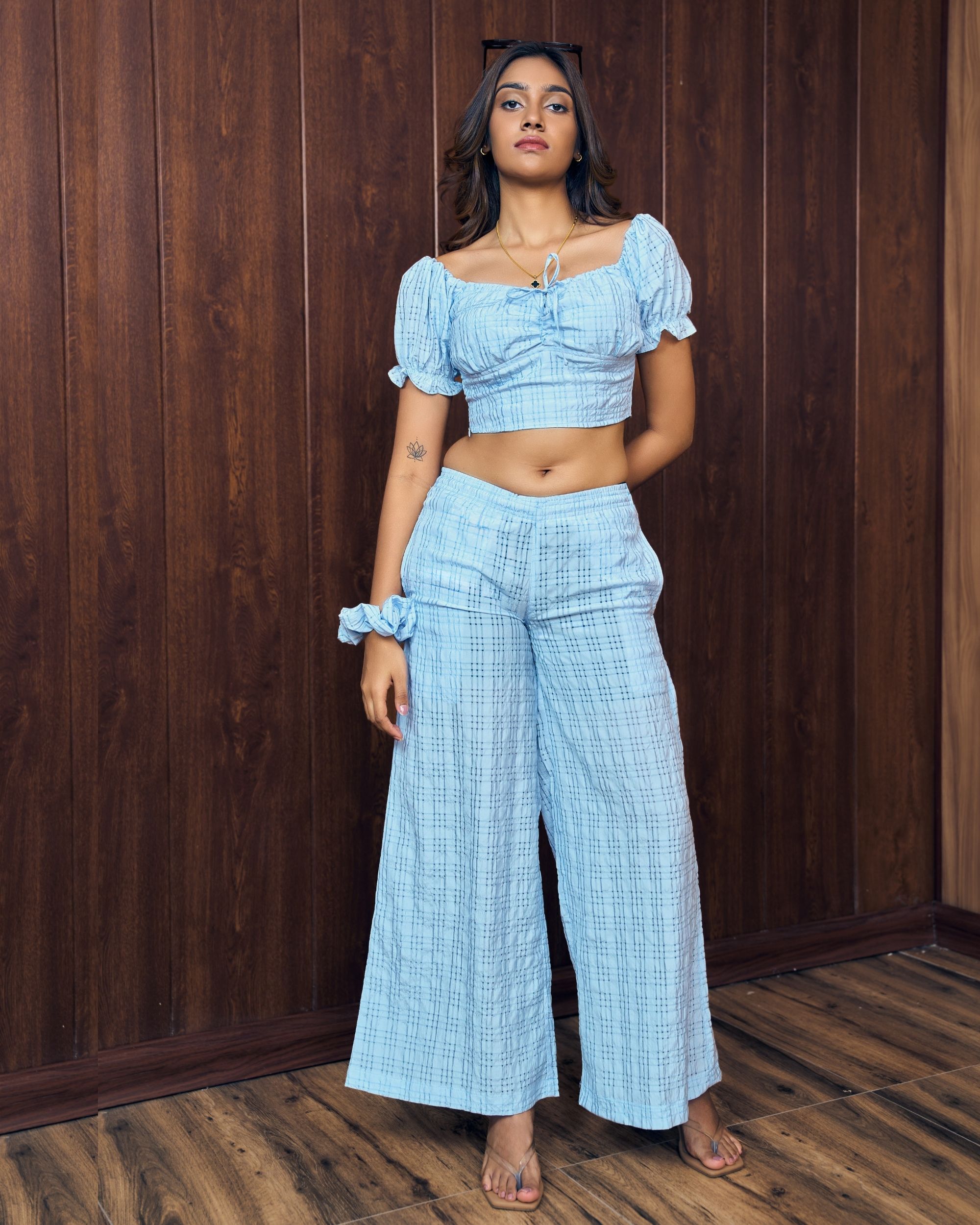 Finished in a soft sky blue tone, the Skyline Wide Leg Pants are perfect for brunch dates, casual day outings, and vacation styling. Pair them with crop tops, fitted tanks, or matching textured pieces for an effortlessly chic Love Colombo look ✨